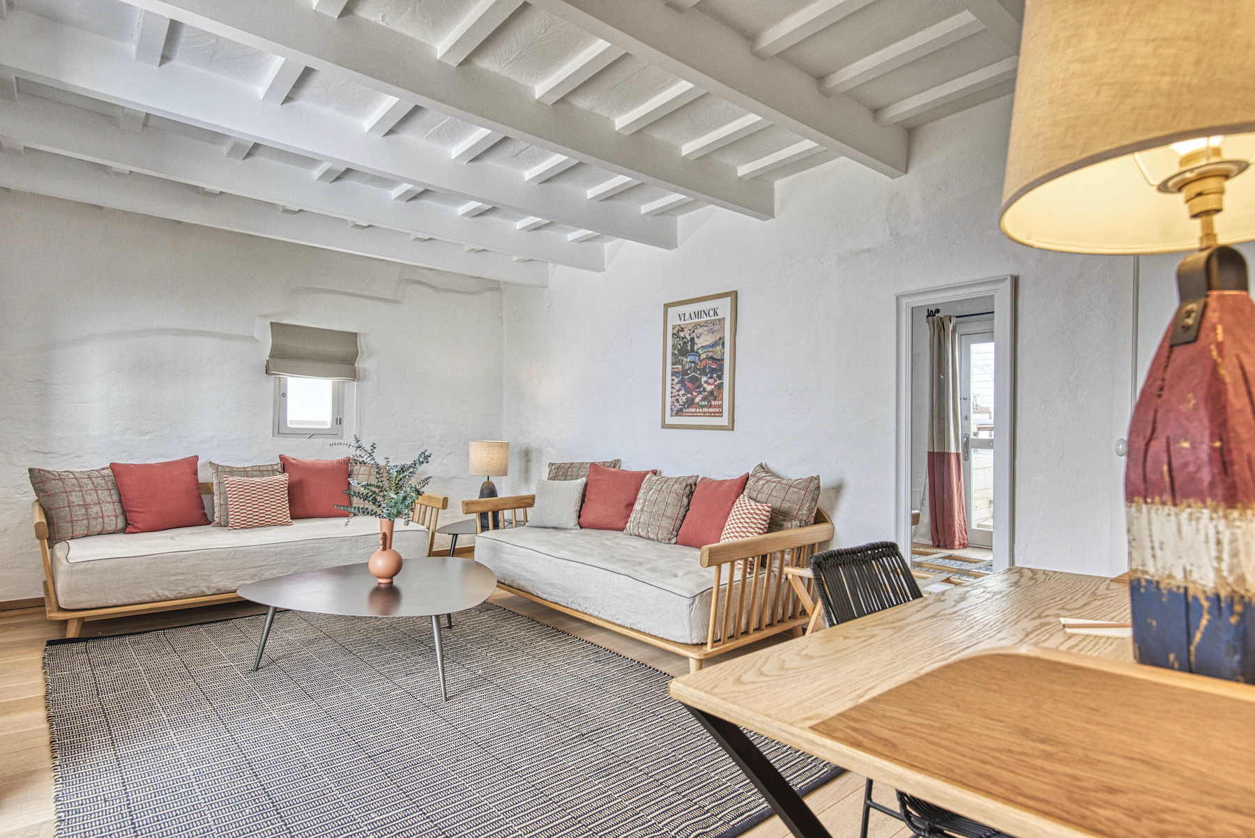 The Terrace Suite, 45 m2, located on the first floor, consists of a bedroom and a small living room that can be converted into a bedroom for two more people. The bathroom with bath and shower is accessible from both bedrooms.